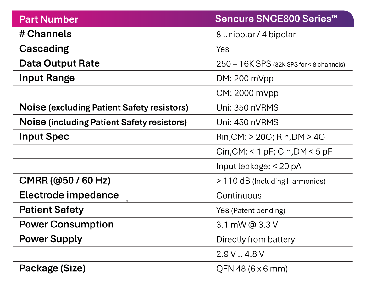 SNCE800 opens more of these applications with its low power consumption and input specifications making them an optimal solution for consumer-grade wearable devices that use dry electrodes. This can bring advanced electrophysiological data capture to consumer health tracking sensors.